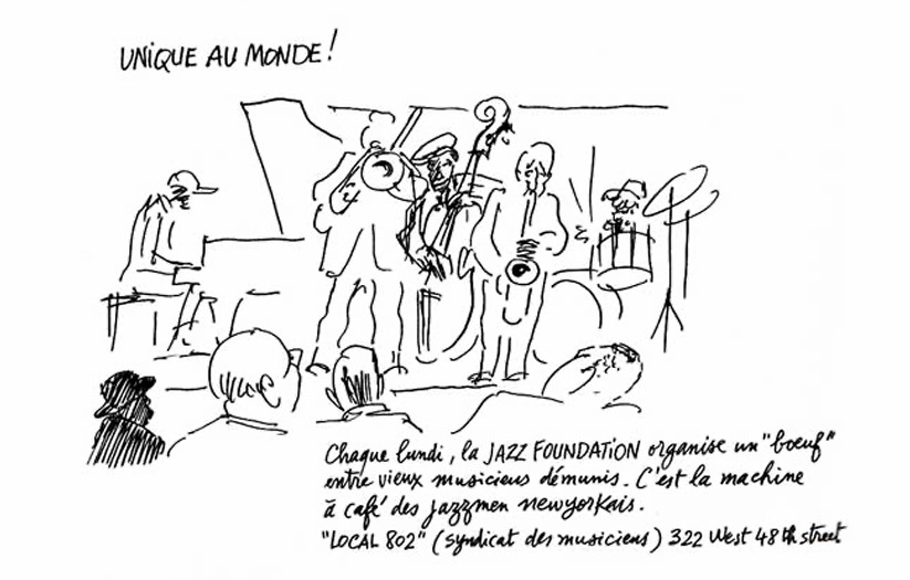 Drawing by Cabu, from Cabu New York, Courtesy of Les Ar nes Photos by Jon Hammond, Santa Istvan Csaba, Mathieu Perez and the Jazz Foundation of America, by courtesy (The credit and the caption are displayed when you hover your mouse over the image.)